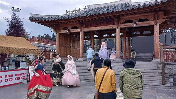 | ▲ 연길시 소영진 리화촌에 위치한 조선족민속원을 방문한 중국인들이 예쁜 한복을 빌려입고 화보촬영에 여념이 없었다. |