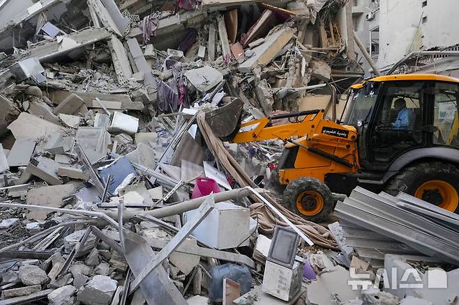 [베이루트=AP/뉴시스] 21일(현지시각) 레바논 베이루트 남부 교외에서 구조대원들이 이스라엘의 공습으로 파괴된 건물 잔해를 불도저로 치우고 있다. 이스라엘군은 전날 밤 헤즈볼라가 운영하는 '알카르드 알하산' 여러 지점을 타격했다. 2024.10.21.
