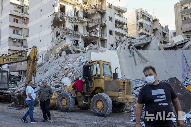 [베이루트=AP/뉴시스] 21일(현지시각) 레바논 베이루트 남부 교외에서 구조대원들이 이스라엘의 공습으로 파괴된 건물 잔해를 불도저로 치우고 있다. 이스라엘군은 전날 밤 헤즈볼라가 운영하는 '알카르드 알하산' 여러 지점을 타격했다. 2024.10.21.