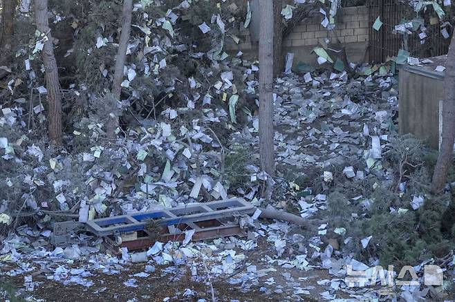 [베이루트=AP/뉴시스] 21일(현지시각) 레바논 베이루트 남부 교외에서 헤즈볼라가 운영하는 금융기관 '알카르드 알하산'이 이스라엘군의 공습을 받아 파괴된 현장에 이 기관의 문서들이 흩어져 있다. 이스라엘군은 전날 밤 헤즈볼라가 운영하는 '알카르드 알하산' 여러 지점을 타격했다. 2024.10.21.