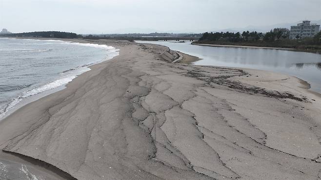 | ▲ 바다로 흘러야 할 모래가 갈길을 잃고 모래톱에 막혀있다. |
