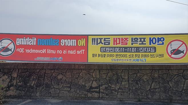연곡천은 연어 자원 조성을 위해 지속 가능한 관리와 보존에 힘쓰고 있지만, 천변 하구에는 동해생명센터에서 설치한 연어 포획 금지 현수막만이 길가에 걸려 있다.