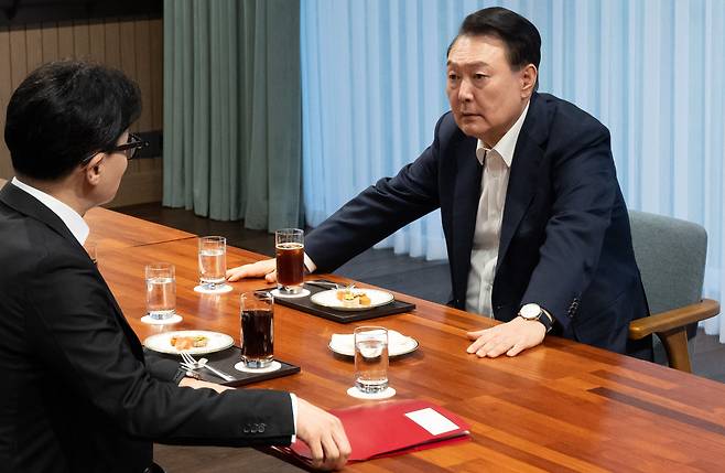 21일 오후 열린 윤석열 대통령과 한동훈 국민의힘 대표의 '면담' 분위기는 대통령실이 배포한 몇 장의 사진이 대변해주는 듯하다.