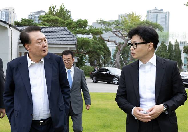 | ▲ 윤석열 대통령, 국민의힘 한동훈 대표와 면담 윤석열 대통령이 21일 서울 용산 대통령실 앞 파인그라스에서 국민의힘 한동훈 대표를 만나 대화하고 있다. 2024.10.21 [대통령실 제공] |