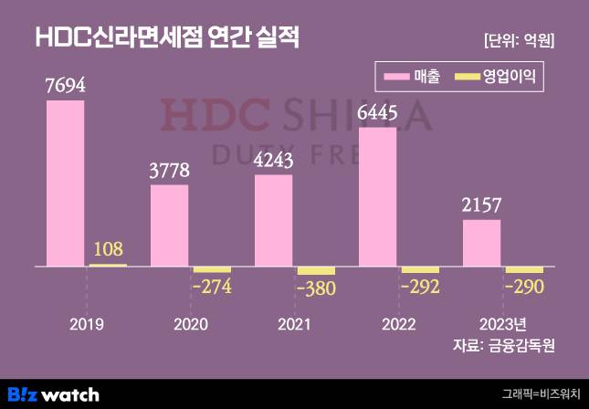 실제로 HDC신라면세점은 2019년 매출액 7694억원, 영업이익 108억원을 기록하며 사상 최대 실적을 쓴 이후 실적이 계속 악화하고 있다. 매출액은 지난해 2157억원까지 쪼그라들었고, 2020년부터 4년 연속 손실을 내고 있다.