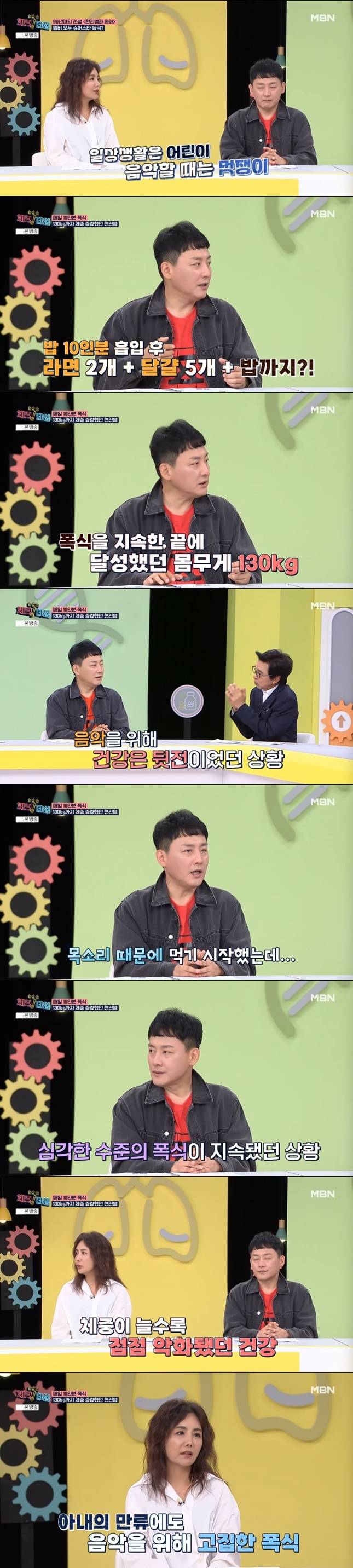 현진영은 "단백질 파우더를 5번 먹고 밥을 그 사이에 5끼를 먹었다. 2인분씩 먹는데 최대한 살을 찌우려는 곳이 상체여서 움직이지 않고 바로 잤다. 움직이면 골고루 찐다. 자고 마지막 5끼째 먹고 라면 2개에 달걀 5개를 넣고 밥을 말아서 먹고 초코파이 한 박스를 먹고 잔다. 그렇게 하니 130kg까지 찌더라. 소리를 얻고 건강을 잃었다"고 설명했다.