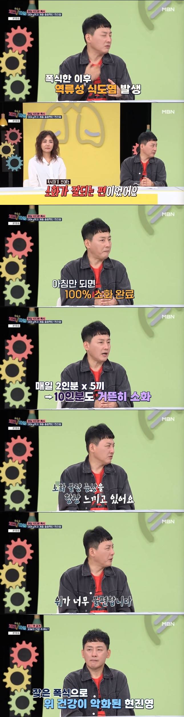 그러면서 "그 전에는 소화가 잘되는 편이었다. 5끼를 전부 다 소화시키고 먹고 자도 아침에 배고팠다. 5년 전부터 조금만 먹어도 속이 더부룩하고 얼마 먹지도 않았는데 목 끝까지 음식이 차있는 느낌이었다. 살짝만 건드려도 올라올 것 같은 느낌을 중간에 느꼈다. 항상 소화 불량을 달고 산다.위가 너무 불편하다"고 토로했다.