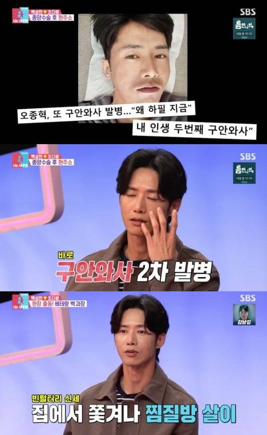 오종혁은 과거 2번의 구안와사가 왔다고 밝혔다. 그는 “2014년에 뮤지컬 두 작품, 드라마 촬영까지 하면서 스트레스 받고 하니까 한번 얼굴이 주저앉았었다"며 "그때는 뭔지도 몰랐다. 치과에서 마취하면 얼얼하지 않나. 입을 다물고 싶은데 안 되더라"며 안면신경 통제가 불가능했다고 털어놨다.