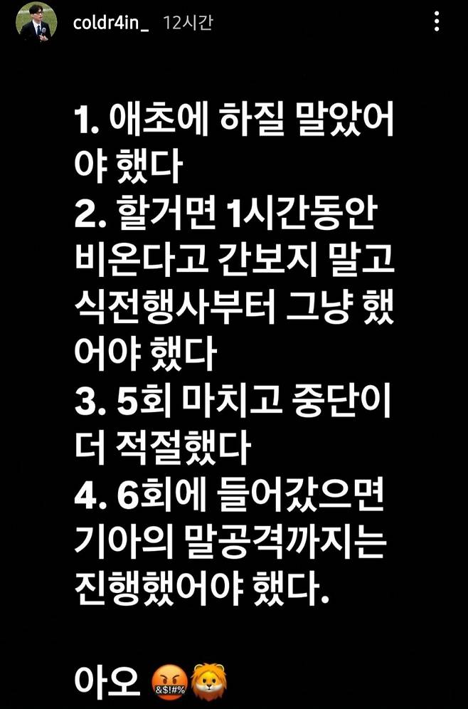 박 위원은 ▲1. 애초에 하질 말았어야 했다 ▲2. 할거면 1시간동안 비온다고 간보지 말고 식전행사부터 그냥 했어야 했다 ▲3. 5회 마치고 중단이 더 적절했다 ▲4. 6회에 들어갔으먄 KIA (6회)말 공격까지는 진행했어야 했다고 자신의 SNS에 글을 올렸다.