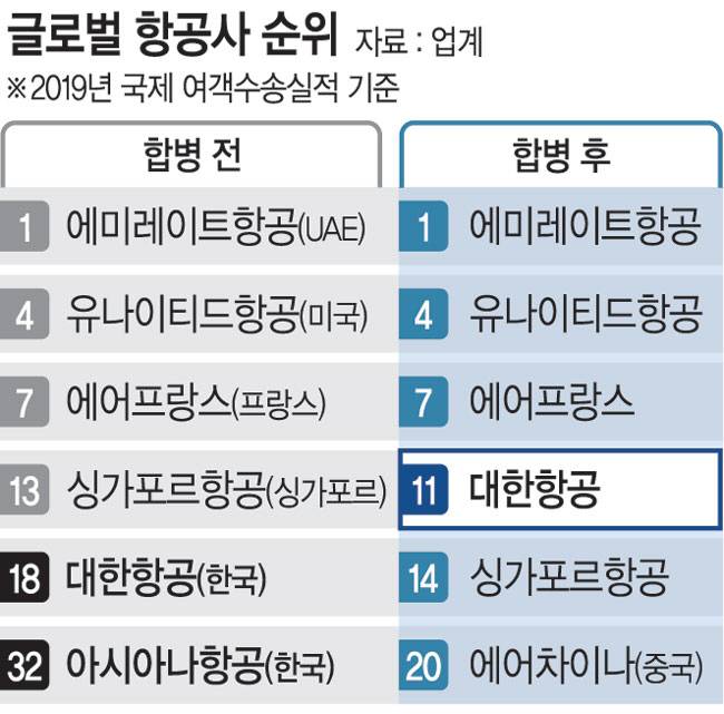 대한항공과 아시아나항공의 합병이 임박함에 따라 국내 항공 업계의 지각 변동이 본격화할 전망이다. 합병이 완료되면 대한항공은 여객 수송(국제선) 기준 글로벌 18위권에서 11위권으로 단숨에 도약하게 된다. 대한항공은 합병 이후 규모의 경제를 통해 항공 경쟁력을 강화하고 소비자 편익을 개선해 나간다는 계획이다. 합병 성사 시 양사 자회사 간 합병도 진행되는 만큼 국내 저비용항공사(LCC) 업계에도 적지 않은 변화의 바람이 불 전망이다.