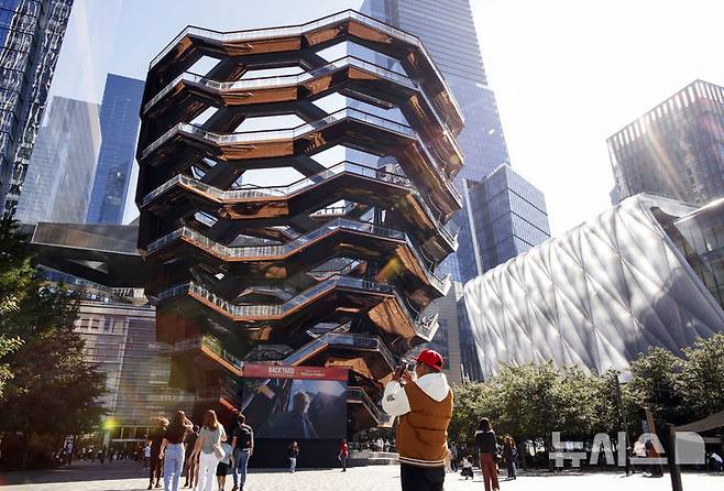 [뉴욕=AP/뉴시스] 21일(현지시각) 미국 뉴욕 맨해튼의 허스든 야드에 재개장한 관광 명소 '베슬'에서 한 남성이 기념사진을 찍고 있다. 잇단 자살 사건으로 2021년 1월 폐쇄됐던 '베슬'이 철제 그물망 등 안전장치를 갖추고 이날 재공개됐다. 2024.10.22.