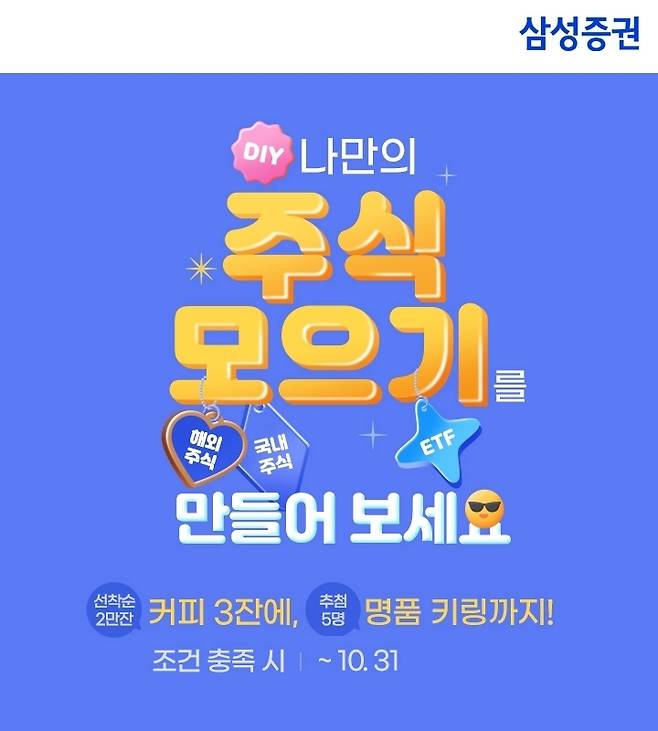 오는 30일까지 삼성증권 모바일 앱을 통해 '주식 모으기'나 'ETF 모으기'를 1종목 이상 등록하고 모으기에 성공한 고객을 대상으로 커피 기프티콘 최대 3잔(선착순 2만잔)을 제공합니다. '주식 모으기'나 'ETF 모으기'를 10번 행한 고객에겐 추첨을 통해 명품 키링도 제공합니다.
