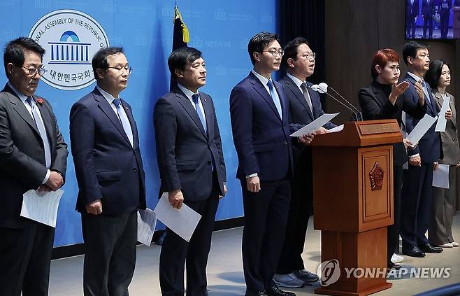 (서울=연합뉴스) 신준희 기자 = 더불어민주당 김승원 의원과 조국혁신당 박은정 의원 등 야당 법제사법위원회 소속 의원들이 22일 국회 소통관에서 김건희 여사 동행명령장 집행 관련 기자회견을 하고 있다. 2024.10.22