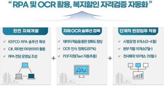 RPA는 소프트웨어 로봇이 사람의 행동을 모방해 단순 반복적인 업무를 대체하는 기술이다. 한전은 인공지능(AI)에 문서와 이미지 등에서 문자 정보를 추출하는 OCR 기술을 접목해 RPA를 개발했다.