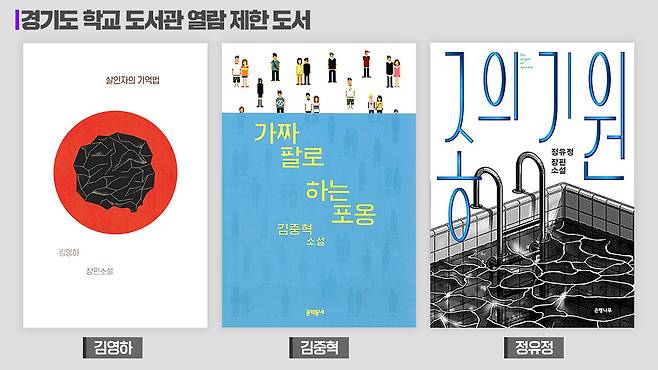학생들에게 열람 제한된 도서에는 해외에 활발하게 번역되며 한국 현대 문학을 대표하는 작가들의 작품도 포함됐습니다. 김영하의 '살인자의 기억법'과 '엘리베이터에 낀 그 남자는 어떻게 되었나', 김중혁의 '가짜 팔로 하는 포옹', 정유정의 '종의 기원' 등이 열람 제한 목록에 들어갔습니다. '살인자의 기억법'은 독일에서 독립출판사 문학상, 추리문학상을 수상했고 일본번역대상을 받기도 했습니다. '종의 기원'은 미국 최대 출판사인 펭귄북스를 포함해 20여 개국에 소개된 작품입니다.