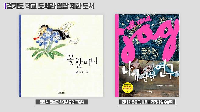 유해한 성교육 도서로 보기 힘든 어린이 청소년 책도 열람 제한 도서 목록에 포함됐습니다. 일본군 위안부 피해자인 심달연 할머니의 증언을 토대로 만든 그림책 '꽃 할머니'가 대표적입니다. 출판사에 따르면 이 책은 한중일 출판사가 공동 기획해 출간한 '평화 그림책'으로, 온라인 서점들은 이 책을 초등학교 고학년 추천도서로 분류하고 있습니다.