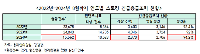 같은 기간 스토킹 범죄로 경찰이 긴급응급조치를 신청한 사건은 2,873건으로, 전체의 18.46%에 불과했습니다. 스토킹 신고자 5명 중 1명에게만 피해자 보호 조치가 이뤄지는 셈입니다.