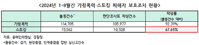 용혜인 의원실이 경찰청에서 받은 자료를 보면 지난 1월부터 8월까지 가정폭력 출동 사건의 판단조사표 작성률은 92.39%지만, 스토킹 범죄의 경우는 67.65%에 그쳤습니다.