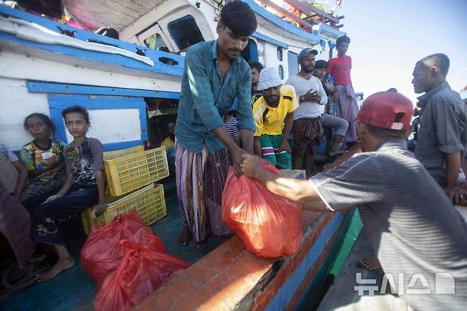 [라부한 하즈=AP/뉴시스] 22일(현지시각) 인도네시아 아체주 라부한 하즈 해안 인근에 정박한 선박 갑판에서 한 로힝야 난민이 현지 어민들이 가져다준 음식을 받고 있다. 10월이 되면서 인도양 벵골만 바다가 잠잠해지자 방글라데시 난민촌에서 생활하던 로힝야 난민들이 무슬림 국가인 말레이시아나 인도네시아 등지로 가기 위해 바다로 나서고 있다. 2024.10.22.