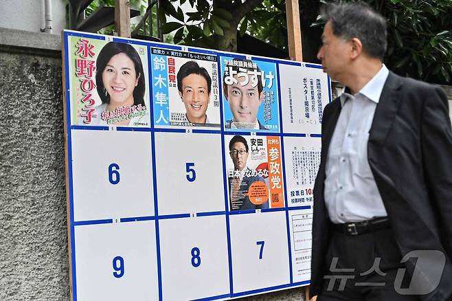 (도쿄 AFP=뉴스1) 김지완 기자 = 18일 일본 도쿄 중심가에서 한 남성이 중의원 선거에 출마한 후보자들의 포스터가 붙여진 게시판 옆을 지나가고 있다. 2024.10.18