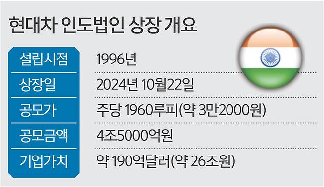 현대차 인도법인의 공모가는 희망 공모가 밴드의 최상단인 주당 1960루피(약 3만2000원)로 책정됐으며, 주식 배정 청약 마감 결과 공모 주식 수의 2.39배의 청약이 몰렸다. 공모가 기준 현대차 인도법인의 전체 공모 금액은 약 4조5000억원 규모다.
