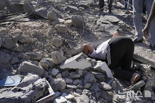 [베이루트=AP/뉴시스] 22일(현지시각) 레바논 베이루트 남부 인구 밀집 지역에서 한 주민이 이스라엘 공습으로 파괴된 건물 잔해 속에서 가족을 찾고 있다. 파괴된 건물은 인근 정부 병원과 마주한 것으로 알려졌다. 2024.10.22.
