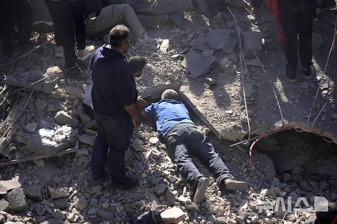 [베이루트=AP/뉴시스] 22일(현지시각) 레바논 베이루트 남부 인구 밀집 지역에서 한 주민이 이스라엘 공습으로 파괴된 건물 잔해 속에서 가족을 찾고 있다. 이 건물은 인근 정부 병원과 마주한 것으로 알려졌다. 2024.10.22.