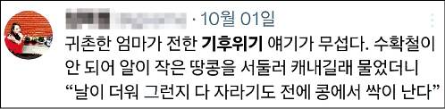 농산물도 기후 위기의 직격탄을 맞았다. 어머니가 땅콩농사를 짓는다는 한 엑스 이용자는 “날씨가 더워 콩에서 싹이 자라 수확철이 아닌데도 미리 땅콩을 캘 수밖에 없었다더라”고 말했다(사진). 또 다른 엑스 이용자는 배추가 한포기에 2만2000원인 사진을 올리며 “올해 김장은 어떻게 준비해야 할지 모르겠다”고 전했다.