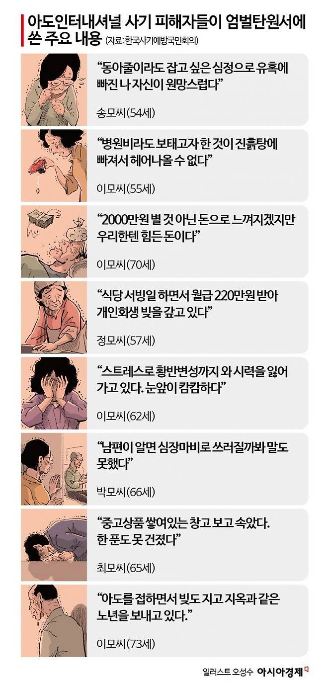 노년층 피해자가 많은 아도인터내셔널 사건에서 개인별 피해 금액은 크지 않다. 하지만 피해자가 감당해야 하는 일상은 훨씬 더 고통스럽다. 노년층일수록 재취업이 어렵고 사기로 무너진 삶을 복구하기 쉽지 않아서다. 탄원서에 "70대 중반이 넘은 노인"이라고 본인을 소개한 이정수씨(가명)는 "아도인터내셔널을 접하게 되면서 빚도 지고 지옥과도 같은 노년을 보내고 있다"고 썼다.