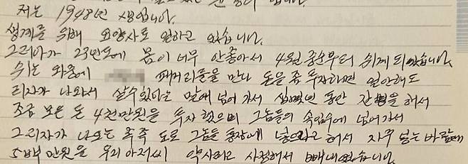 "빚에 시달려 사람 구실도 할 수 없습니다." 노인의 삐뚤빼뚤한 서체에는 절박함이 묻어났다. 아도인터내셔널 사기피해자 권현선씨(가명)가 엄벌탄원서에 써 내려간 문장이다. 경기 부천에 거주하는 그는 남편이 간암으로 치료를 받던 중 아도인터내셔널 사기에 속아 신용카드 대출을 내 5000만원의 거금을 투자했다 돈을 몽땅 날렸다.
