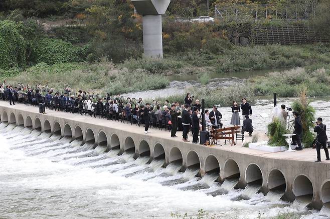 평창의 전통 음식들이 현장에서 조리됐다. 거문고, 대금 등 전통 음악이 예식 내내 배경 음악으로 연주됐다. 단풍으로 채색한 산들이 축하 병풍을 둘렀다. 가을비 치곤 큰비가 내렸던 터라 오대천 물줄기도 푸짐한 박수를 보냈다. 신랑 신부도 하객도 모두 하나로 이어졌다. 작가 한강이 노벨 문학상을 받았다. 만약 '대한민국 결혼상'이 있다면 료한(한병찬) - 조유진 부부가 받으리라.