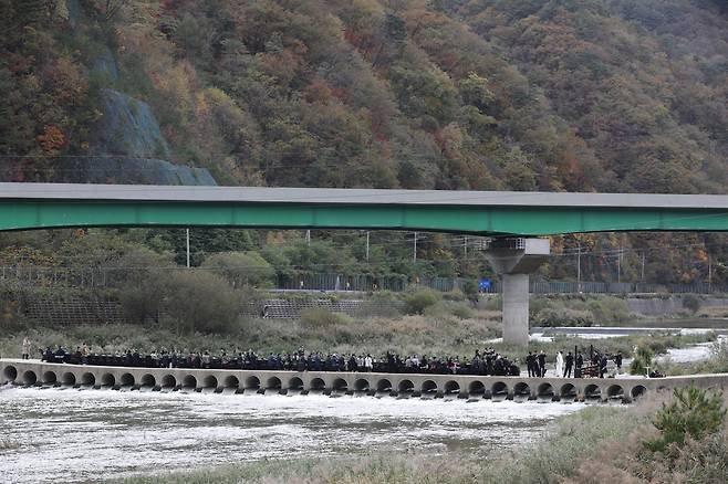 "우리 마을에 살지도 않는 어떤 젊은이가 찾아와 우리 마을에서는 잠수교라고 불리는 마평1교 다리에서 결혼식을 하고 싶다고 하네요. 당일 주민들 통행에 불편을 끼칠까 봐 마을 발전 기금으로 상당액을 낸다고 해요. 희한한 일도 다 있지요. 주민총회를 거쳐 승낙을 했어요."