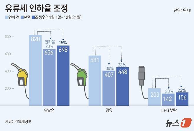 (서울=뉴스1) 김초희 디자이너 = 기획재정부는 이달 종료 예정인 유류세 한시적 인하 조치를 12월 31일까지 2개월 연장한다고 23일 밝혔다. 휘발유에 대한 인하율은 기존 20%에서 15%로, 경유·액화석유가스(LPG)부탄에 대한 인하율은 30%에서 23%로 각각 조정한다.