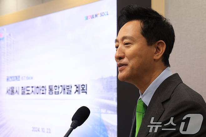 (서울=뉴스1) 박정호 기자 = 오세훈 서울시장이 23일 오전 서울 중구 서울시청에서 서울시 철도지하화 통합개발 계획을 발표하고 있다. 2024.10.23/뉴스1