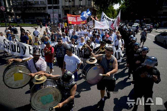 [부에노스아이레스=AP/뉴시스] 22일(현지시각) 아르헨티나 부에노스아이레스에서 공공 보건 종사자들이 하비에르 밀레이 대통령의 공공 보건 서비스 예산 삭감에 반대하며 행진하고 있다. 2024.10.23.