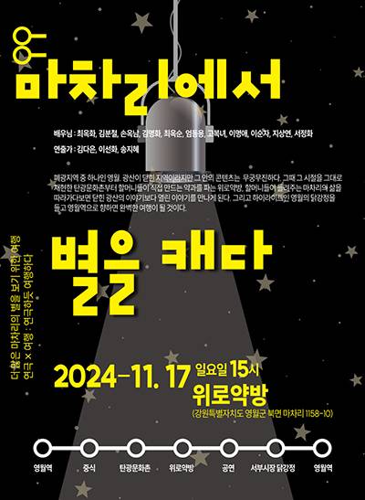 영월과 아무런 연고도 없는 한 청년은 우연히 마주한 옛 탄광마을 마차리에 첫눈에 반했다. 마을에 마음을 주니 그 마을에 사는 사람들에 대한 애정과 궁금증도 새록거렸다. 그는 마차리에서 평생을 살아온 할머니들의 인생 이야기를 듣고 싶었다. 솔직하고 진솔한 할머니들의 이야기를 들으며 그 삶을 담은 연극을 만들기로 했다. 할머니들에게는 생전 처음 가져 보는 '배우님'이라는 타이틀 아래 당신의 이야기를 할 기회를, 외지 여행자들에게는 탄광 마을에서 살아온 어르신의 삶을 들여다볼 기회를 제공하고자 한다. 무대에 서겠다고 지원한 할머니들은 매주 마차리의 한 회관에 모여 연극 연습을 했다. 힘들고도 신명 났던 연습 끝에 피어난 결과물이 11월 10일 무대에 오른다. 탄광 마을에서 일생을 보낸 할머니들의 진짜 인생이 담긴 연극을 감상하고, 그때 그 시절을 재현한 탄광문화촌과 동네 할머니들이 손수 만든 약과를 파는 위로약방 등을 두루 돌아보는 특별한 여행 프로그램을 준비했다.