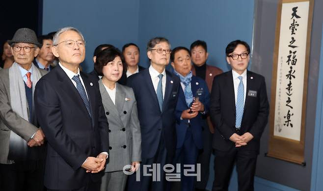 [이데일리 방인권 기자] 유인촌 문화체육관광부 장관과 강정애 국가보훈부 장관, 김황식 안중근의사숭모회 이사장을 비롯한 참석자들이 23일 오후 서울 종로구 대한민국역사박물관에서 열린 안중근 의사 하얼빈 의거 115주년 기념 특별전시 '안중근 書' 개막식에서 전시물을 살펴보고 있다.