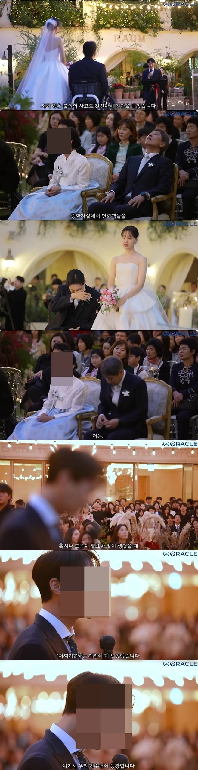 "오늘부터 신부 송지은 양의 영원한 서방님"이라고 말문을 연 박위의 동생은 "10년 전 저희 형은 불의의 사고로 전신마비 진단을 받았습니다. 우리 가족은 정말 힘들었습니다. 중환자실에서 면회객들을 미소로 맞이하고 제한 시간 30분을 거의 다 보내고 난 뒤에 마지막 제 면회 차례가 되면 형은 진이 빠진 모습으로 저를 맞이했습니다"라며 울먹였다.