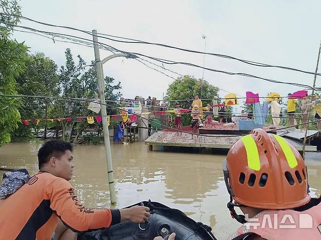[리본=AP/뉴시스] 23일(현지시각) 필리핀 알베이주 리본에서 구조대원들이 제20호 태풍 짜미로 발생한 홍수를 피해 지붕에 고립된 주민들을 구조하고 있다. 2024.10.23.