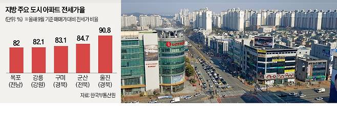 청주와 포항, 강릉, 목포 등 지방 주요 도시의 아파트 전세가율(매매가 대비 전세가 비율)이 80%를 웃도는 것으로 나타났다. 부동산 거래시장 침체가 이어지면서 전셋값보다 매매가격이 더 빠른 속도로 하락하고 있어서다. 통상 전세가율이 80%를 넘으면 ‘깡통전세’(전세금과 담보대출이 매매가를 웃도는 현상) 리스크가 있다고 본다. 비수도권 세입자의 주거 불안도 커지고 있다는 분석이 제기된다.