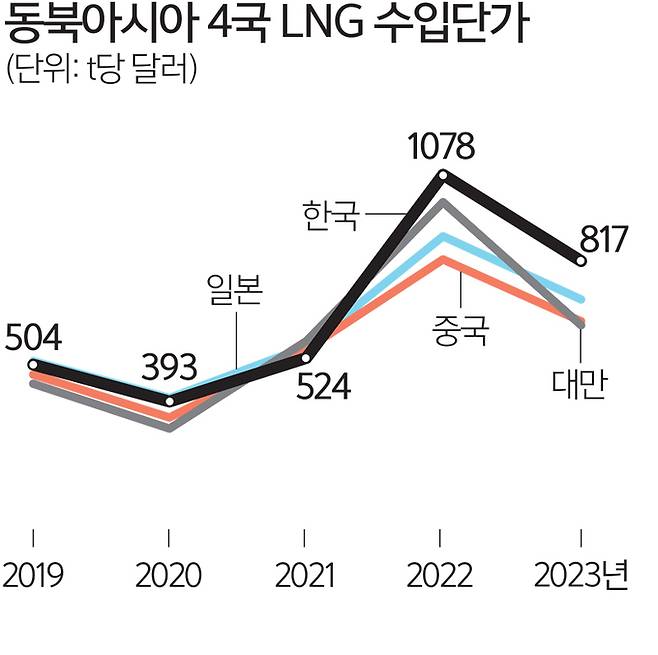 앞선 2022년에도 한국은 주변국보다 LNG를 비싼 값에 사 왔다. 한국의 t당 수입 단가는 1078달러인 데 반해 대만(995달러) 일본(892달러), 중국(822달러)은 1000달러를 넘지 않은 것.