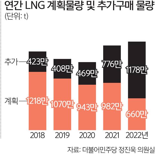 지난 2017년 발표된 8차 전력수급기본계획에 따르면 2022년 우리나라 전력생산용 천연가스 소요 예측치는 660만t이다. 하지만 2022년 실제 사용한 천연가스는 1838만t으로 예측치보다 거의 3배가량 많다. 이처럼 부족분이 발생하면 급하게 현물시장에서 LNG를 구하다 보니 장기계약 때보다 단가가 올라가는 것이다.