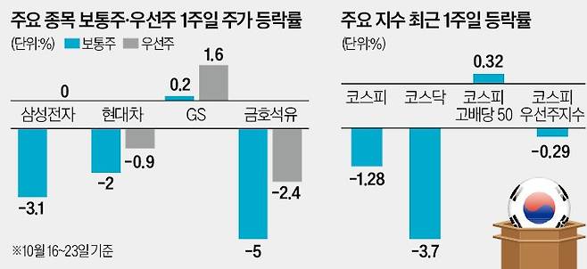 미국 대통령 선거와 실적 하향 우려로 국내 증시 불확실성이 커진 가운데 우선주를 비롯한 고배당 종목의 안정성이 주목받고 있다.