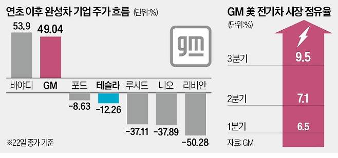 이날 GM 주가는 전 거래일보다 9.81% 급등한 53.73달러에 마감했다. 연초 이후 이날까지 주가 상승률은 49.04%에 달한다. 포드(-8.63%), 테슬라(-12.26%), 리비안(-50.28%) 등 경쟁사는 물론 S&P500의 같은 기간 상승률(23.37%)을 뛰어넘었다.