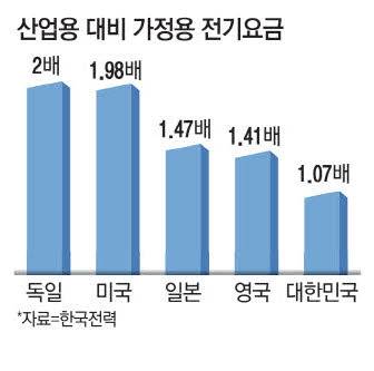 전기요금 인상을 잇달아 산업용에 국한하면서 한국의 가정용 전기요금이 경제협력개발기구(OECD) 국가 중 최하위권에 머물고 있다. 산업용 전기요금을 가정용보다 저렴하게 책정해 산업계를 지원하는 주요국의 흐름과도 역행한다는 지적이 나온다.