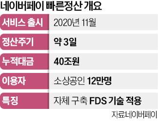 네이버 스마트스토어 월간 거래액의 약 46%가 빠른정산으로 선지급되고 있다. 서비스를 처음 시작한 2020년 11월부터 올해 7월까지 네이버페이 빠른정산 서비스를 이용한 소상공인은 12만 명에 달한다. 선지급한 대금은 약 40조원이다. 같은 규모의 정산대금이 약 6% 금리의 선정산 대출로 취급됐다고 가정하면, 네이버페이 빠른정산 서비스를 이용한 소상공인이 누린 금융 비용 절감 효과는 약 1800억원에 이른다.