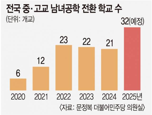 국회 교육위원회 소속 더불어민주당 문정복 의원실이 전국 17개 시·도 교육청으로부터 제출받은 자료에 따르면 2020년부터 지난달까지 전국 83개 단성 학교가 남녀공학으로 전환한 것으로 나타났다. 내년 전환 예정인 학교는 32곳에 달했다.