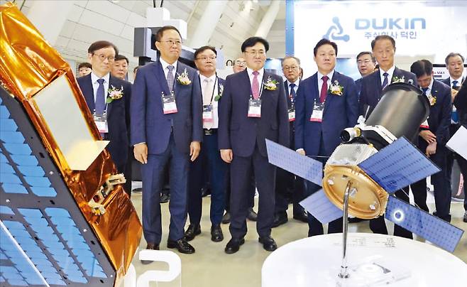국내 최대 우주 행사인 ‘2024 국제우주항공기술대전’이 23일 경남 창원컨벤션센터에서 개최됐다. 김정호 한국경제신문 사장(왼쪽 두 번째), 유상임 과학기술정보통신부 장관(세 번째), 박완수 경남지사(네 번째) 등이 한화에어로스페이스의 광학위성을 살펴보고 있다.