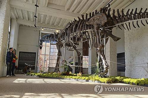 People watch a 69 feet (21 meters) long dinosaur that will go at auction next Nov.16, at the Dampierre-en-Yvelines castle, south of Paris, Wednesday, Oct. 23, 2024. (AP Photo/Marine Lesprit)