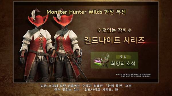 이때 사전 예매자들은 한정 보상인 덧입는 장비 '길드나이트 시리즈'와 호석 '희망의 호석'을 받을 수 있으므로 몬스터 헌터 와일즈를 즐길 계획이라면 되도록 사전 예약으로 구매하는 것을 추천한다. PS 스토어에서 예약한 구매자들에게는 디지털 미니 아트북이 추가 제공된다.